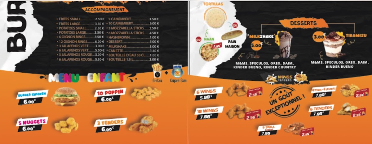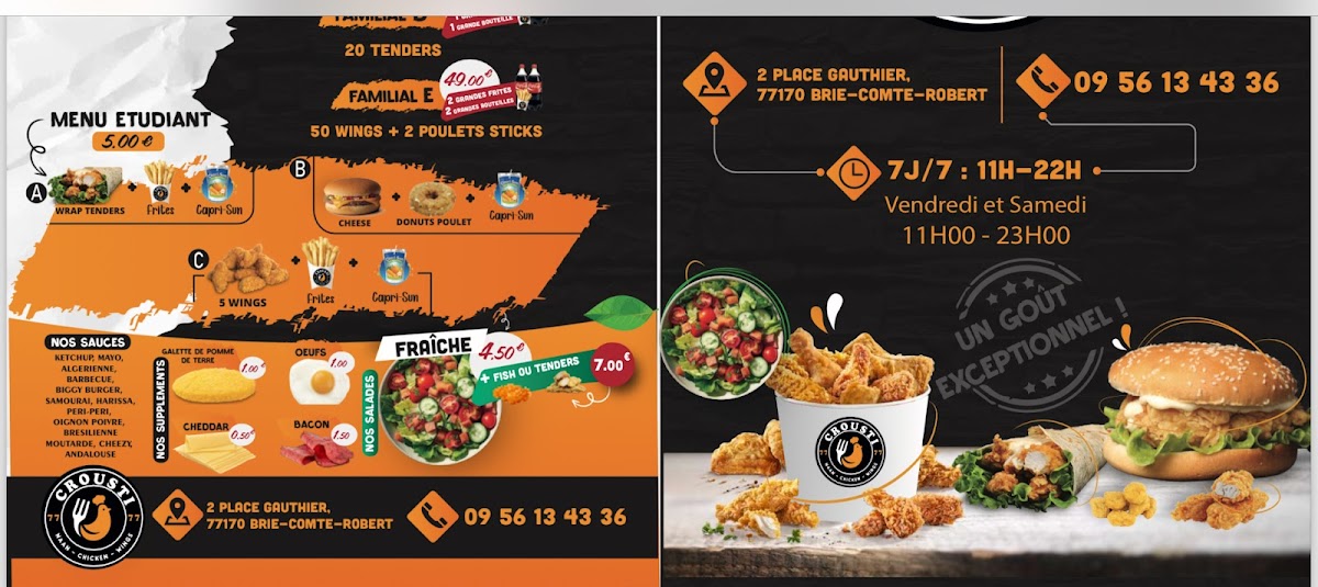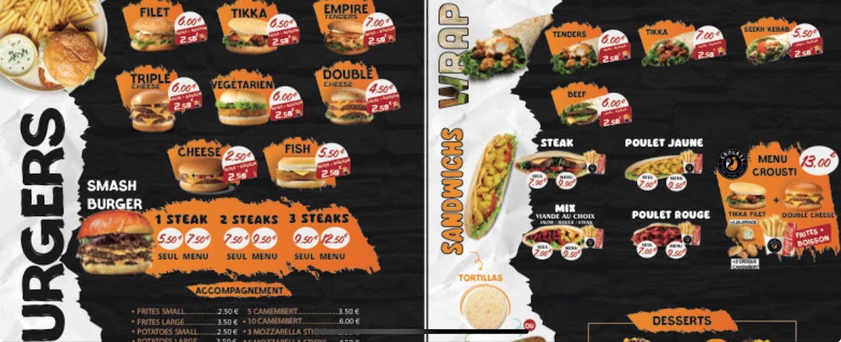 The menu at Crousti 77 focuses on fast food options suitable for quick meals and casual dining. Visitors can expect a variety of prepared dishes commonly found in fast food settings. The offering primarily includes savory items that can be enjoyed for lunch or dinner, with options likely revolving around fried and grilled foods.